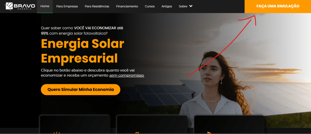 Ao abrir o site da Bravo Energia, você consegue localizar no canto superior direito um link “Faça uma simulação”. Este dá acesso à página da calculadora solar com orçamento grátis.