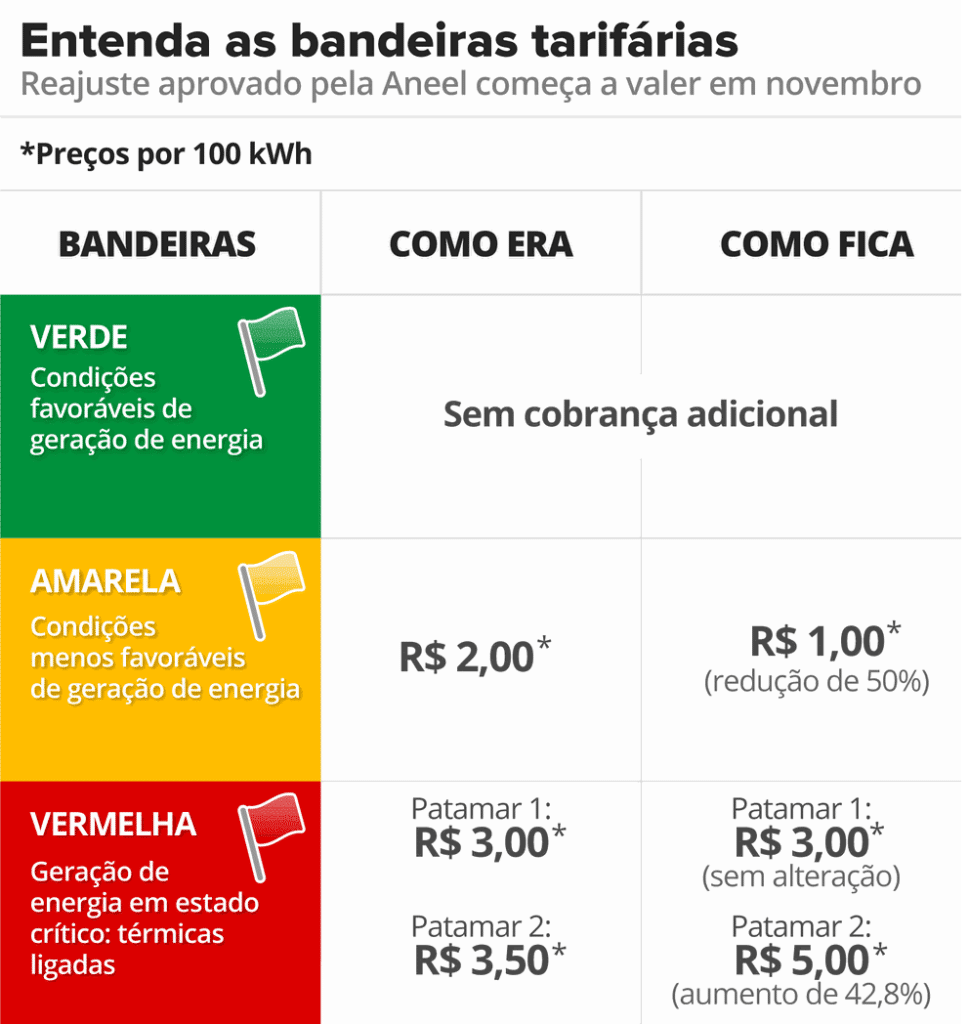 Foi aprovado, no dia 24 de outubro de 2017, o reajuste de 42,8% de aumento no valor da bandeira vermelha no patamar 2. A medida já valerá para o próximo mês, novembro. Com o reajuste, a taxa extra que antes era de R$3,50 passa a ser de R$5,00 a cada 100kWh consumidos. No caso da bandeira amarela houve redução de 50%. O preço que antes era R$2,00 passa a ser de R$1,00 a cada 100kWh consumidos.