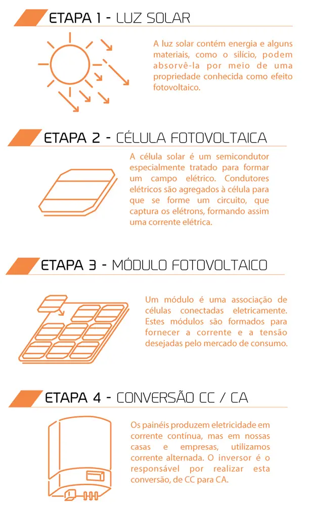 É importante frisar que a energia solar fotovoltaica é diferente da energia solar térmica, utilizada normalmente para aquecimento. A energia solar fotovoltaica consiste na conversão de irradiação solar (luz) diretamente em energia elétrica (eletricidade).